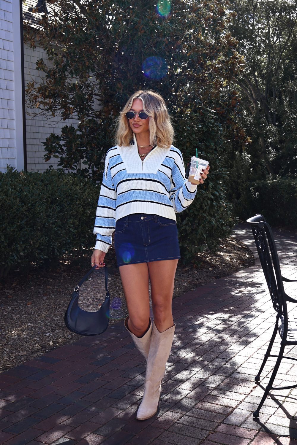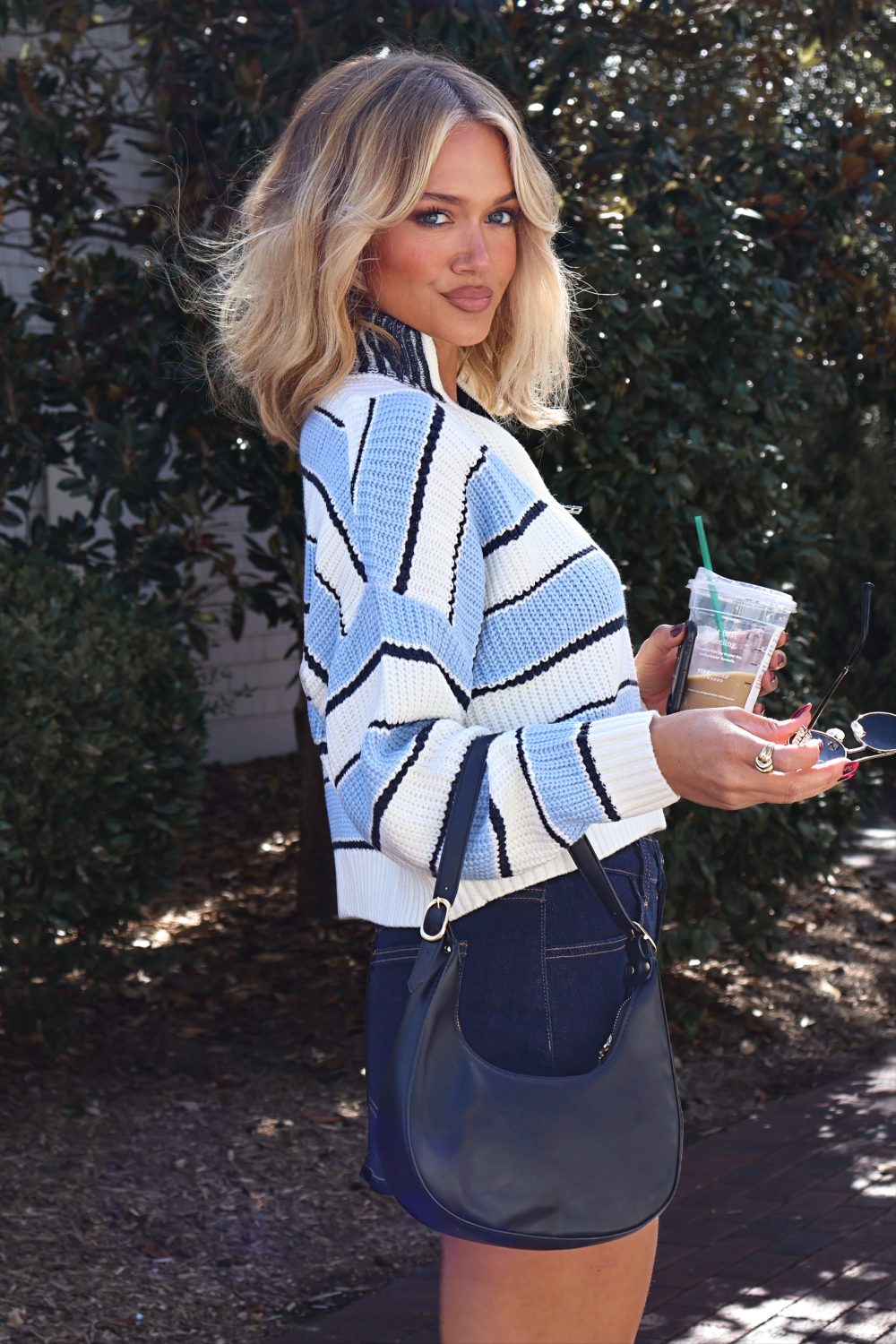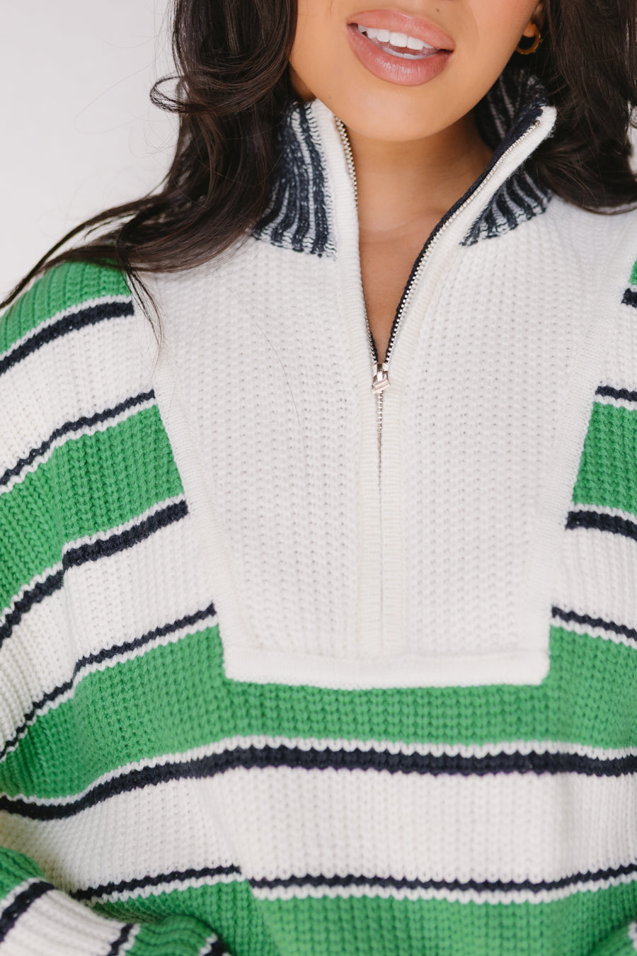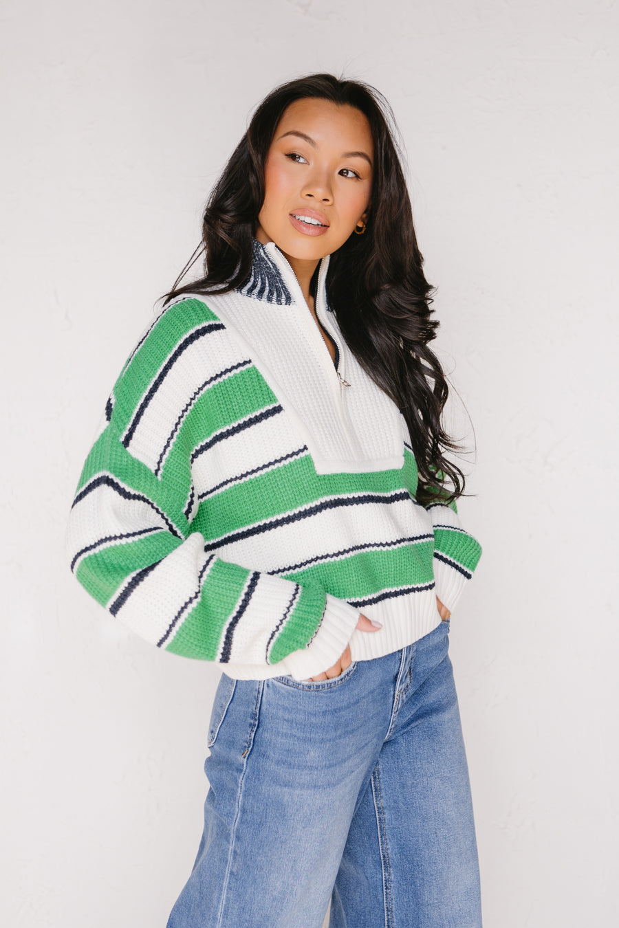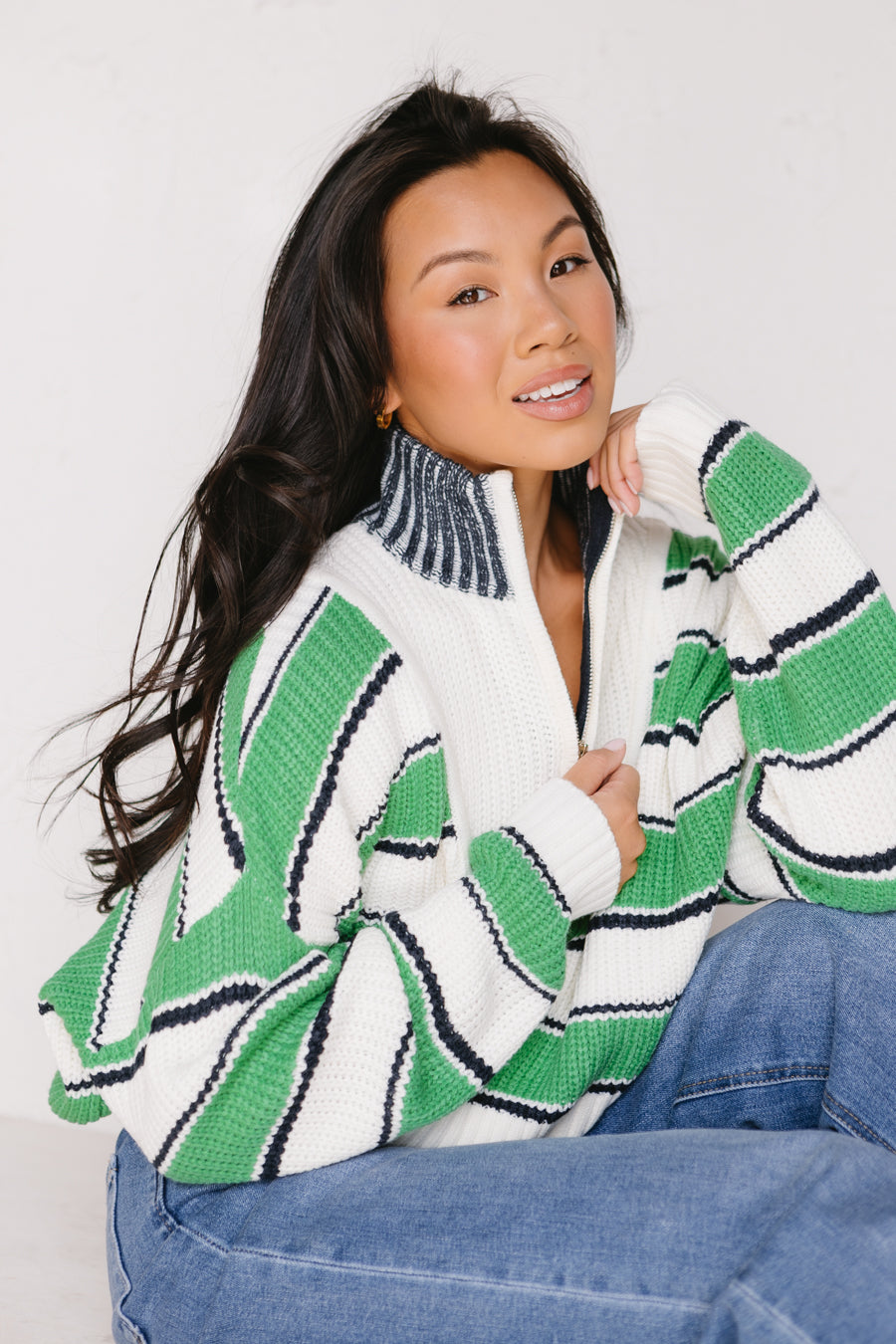 Striped pullover sweaterHalf zipLong sleevesDropped shouldersStanding collar