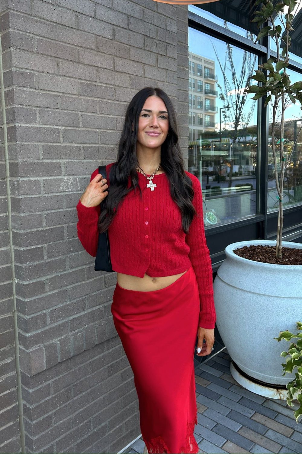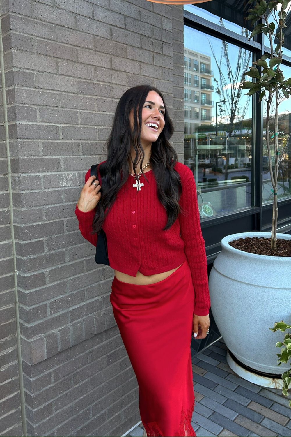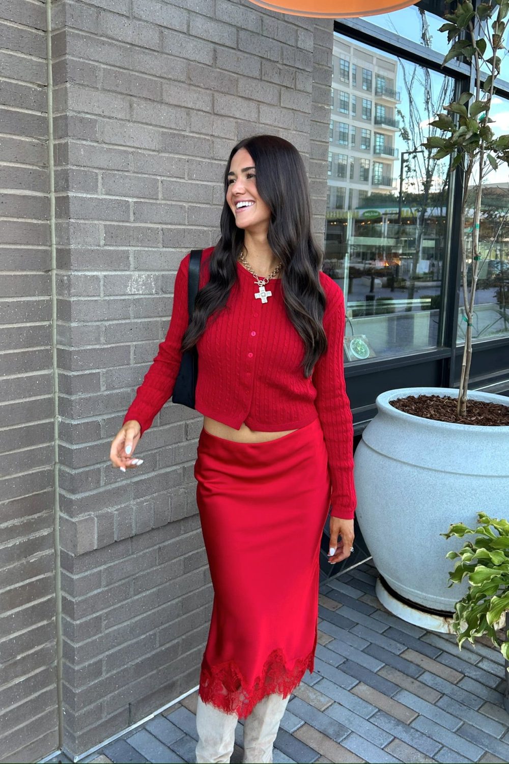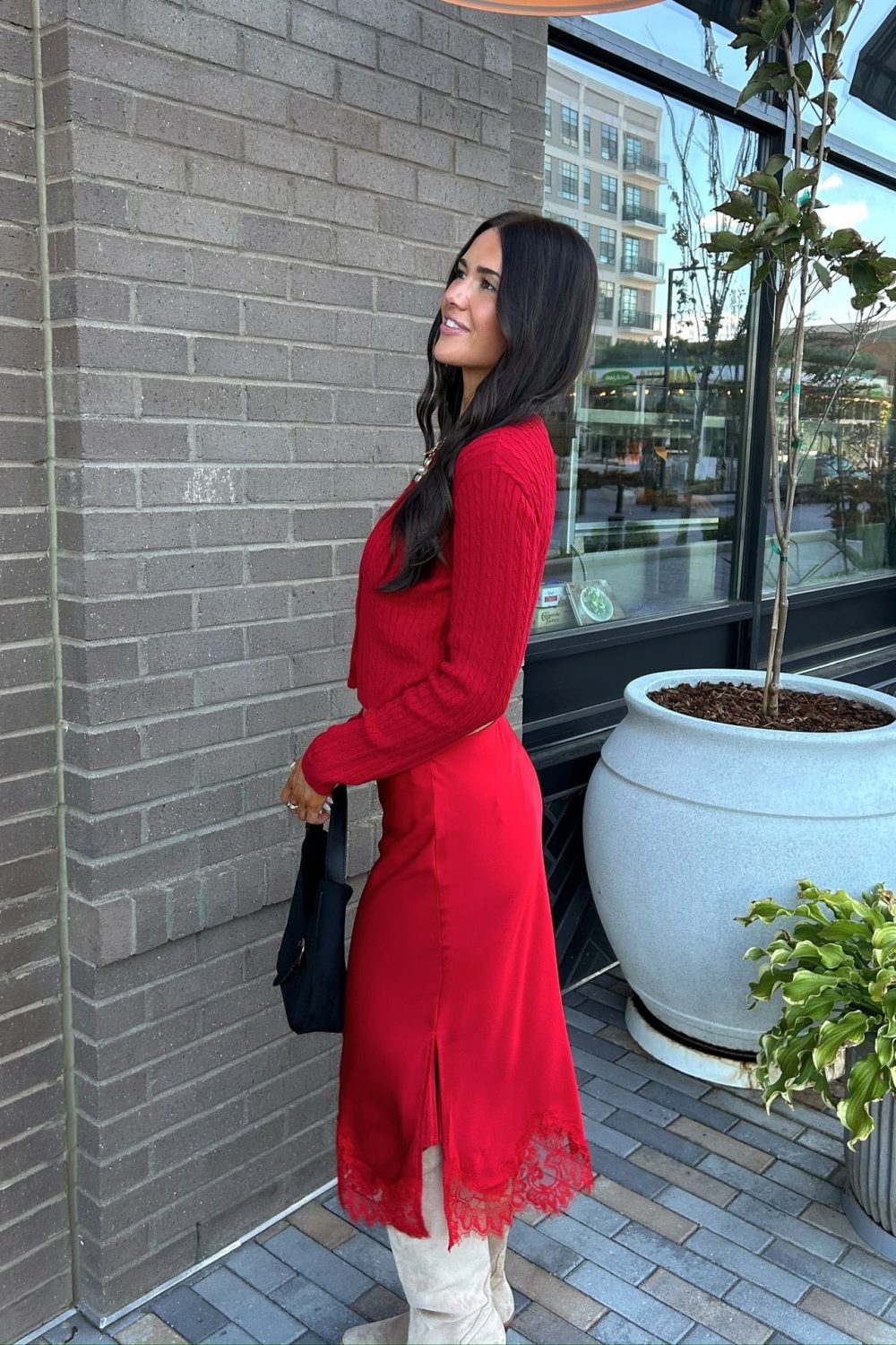 Details Red pullover sweaterCream edge stitch detailLong sleeves with dropped shouldersFront pocket Materials and Care 100% polyesterHand wash coldDry flat